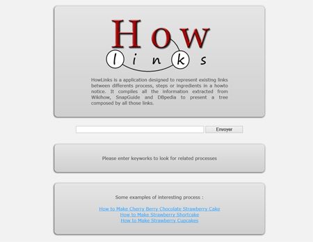 HowLinks is a framework for the integration of procedural knowledge, or "know-how", into the Linked Data Cloud. The purpose is to integrate data from Wikihow, SnapGuide and DBpedia and find links between the different entities (requirements, sub-steps, methods, outputs, inputs). From this information, a representation is available to visualize each process as an expandable tree.