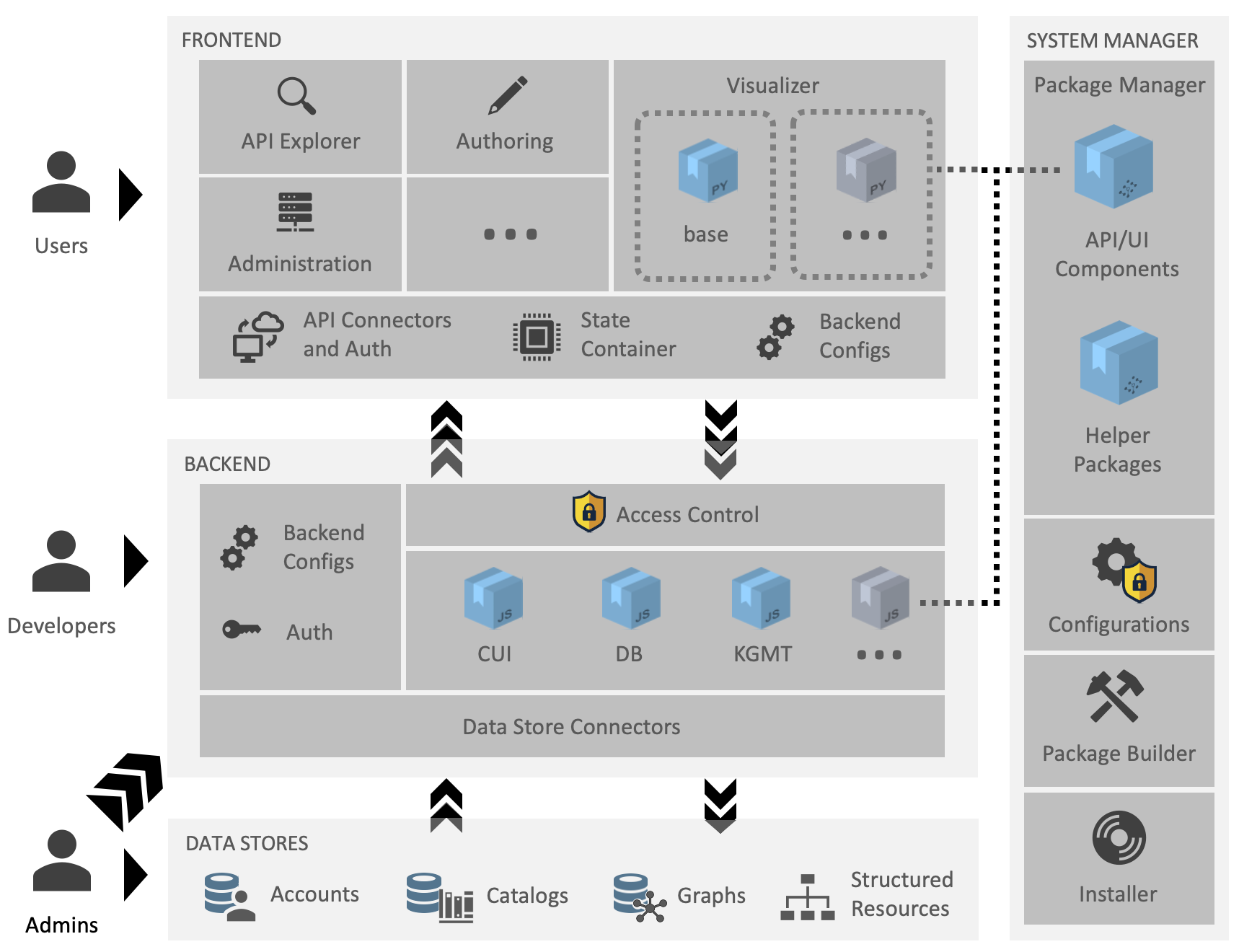 Based on the concept above, we developed a knowledge graph management platform (UWKGM). Our platform enables users to integrate arbitrary functionalities as RESTful API services in order to facilitate the knowledge graph development process. It consists of three main components: the backend (API), the frontend (UI), and the system manager. The backend offers a wide range of functionalities for KG management based on the above concept, while also serves as an API endpoint for the UI and client-side extensions installed to the frontend. Our design principle is to facilitate contributions from communities of researchers and developers in the form of software packages distributed to the platform administrators and end-users. These packages are pluggable UI, API, or hybrid components operated by the platform’s package manager.