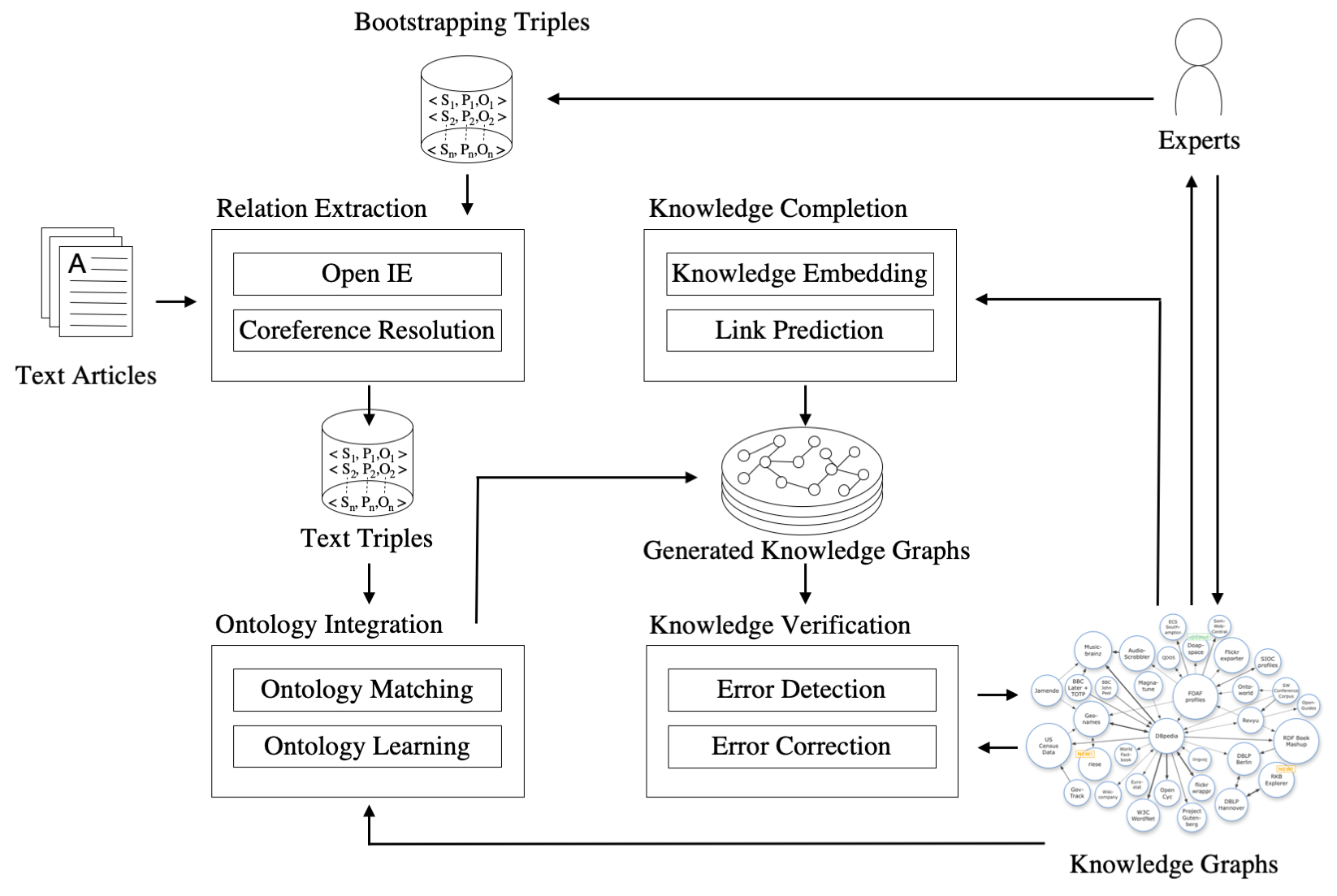 UWKGM consists of four main components: 1) Relation Extraction (RE), 2) Ontology Integration (OI), 3) Knowledge Verification (KV) and 4) Knowledge Completion (KC). RE and OI aim to solve the adding new knowledge problem. KV is to deal with the erroneous knowledge injection problem. KC copes with the inadequate knowledge problem.